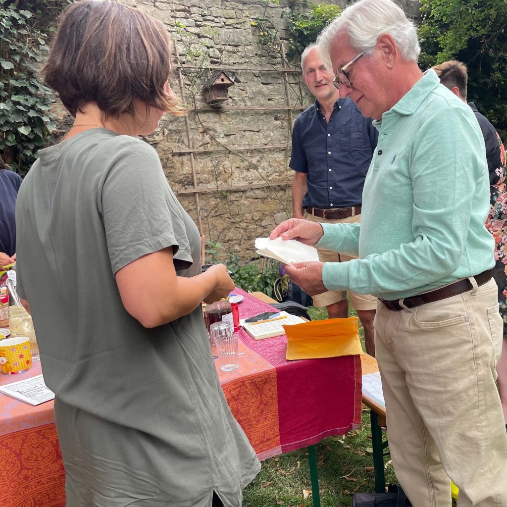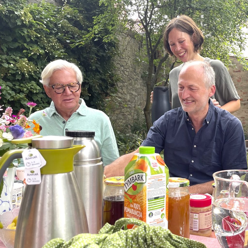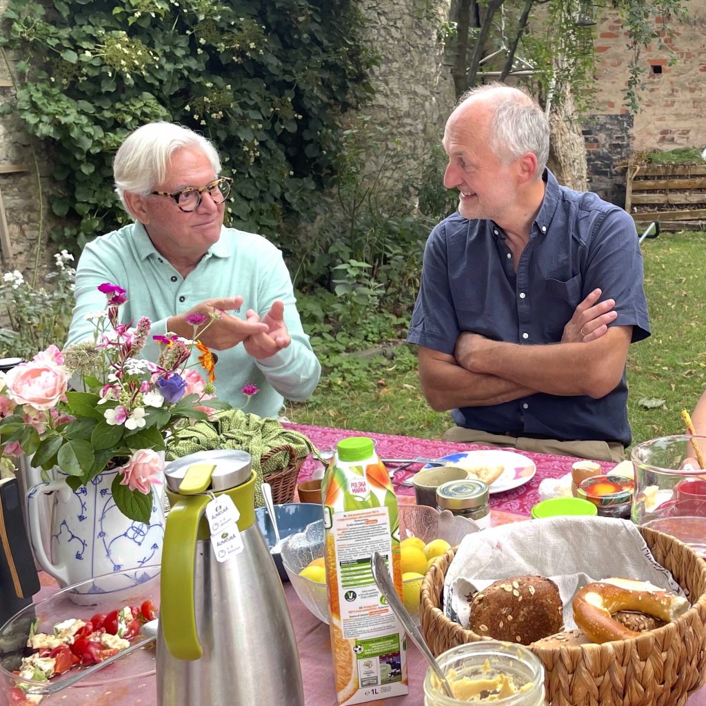 Ein Kennenlernen. Ein fröhliches von vielen Fragen begleitetes. Bei Kaffee und frischen Brötchen. Im Garten und bei bestem Sommerwetter. Am 9. August besuchen Nachfahren der Familie Meininger die WoQua-Mitglieder am Ort ihrer Vorfahren in der Düsteren Strasse. Livingstone Treumann hat mit seinem elfjährigem Enkel Leo die weite Reise aus den USA auf sich genommen, um zu schauen, was sich denn da so tut auf dem Gelände, von dem einst seine jüdischen Vorfahren flohen, ins Exil getrieben, inhaftiert oder von den Nazis umgebracht wurden – wenn sie nicht schon vorher aufgrund der unerträglichen Situation in den Suizid getrieben wurden. Das Göttinger Tageblatt mit Lea Lang und Peter Heller interviewten Livingstone Treumann und berichteten am 26.8. 2025 darüber. Hier die PDF-Datei >>>